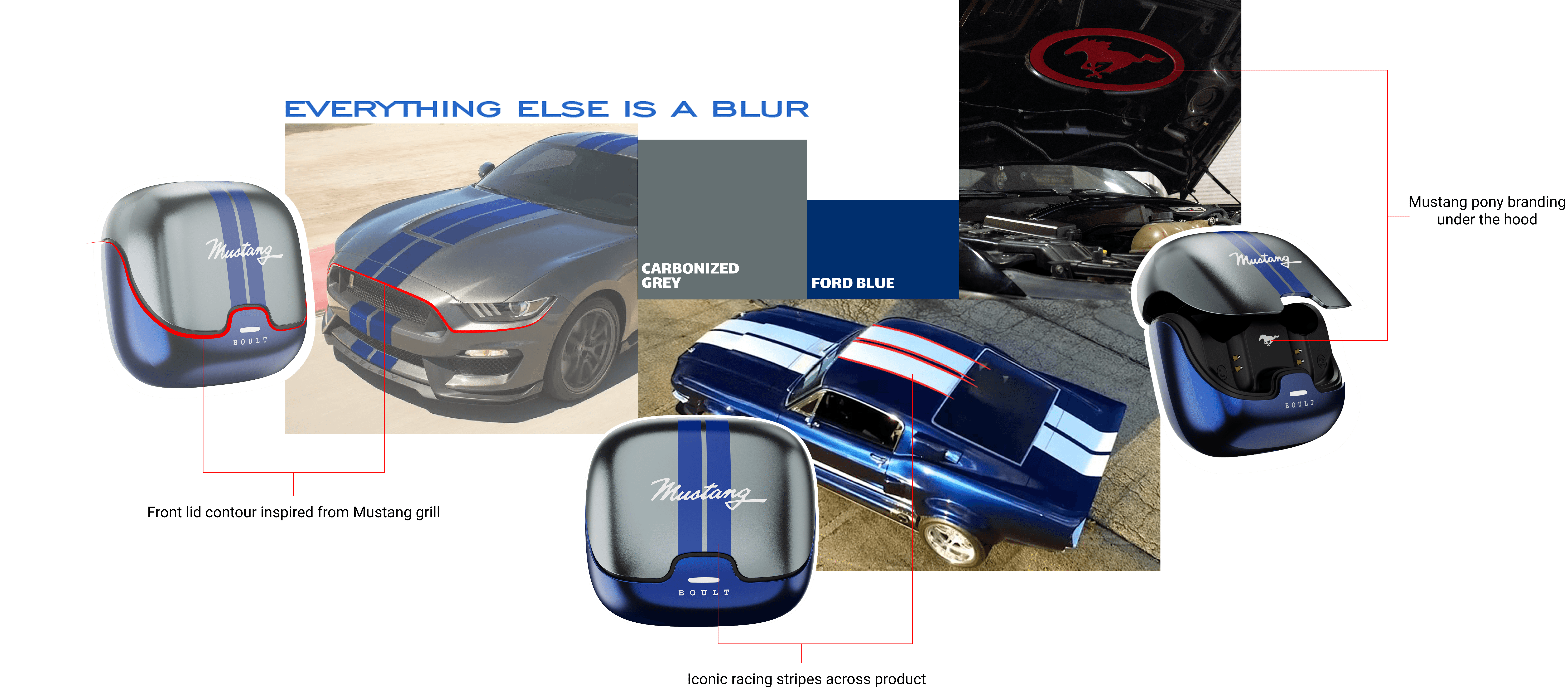 The final direction for the DASH CMF showcases a bold, performance-oriented scheme with a forward-looking attitude. Carbon Grey serves as the primary tone, while the signature Ford Blue reflects the brand’s long-standing heritage in the automotive world. The Ford Blue create a striking resemblance to the original icon. The Boult Z40 lineup chosen for this concept further reinforces the Mustang identity with a silhouette that echoes the car’s signature front grille.