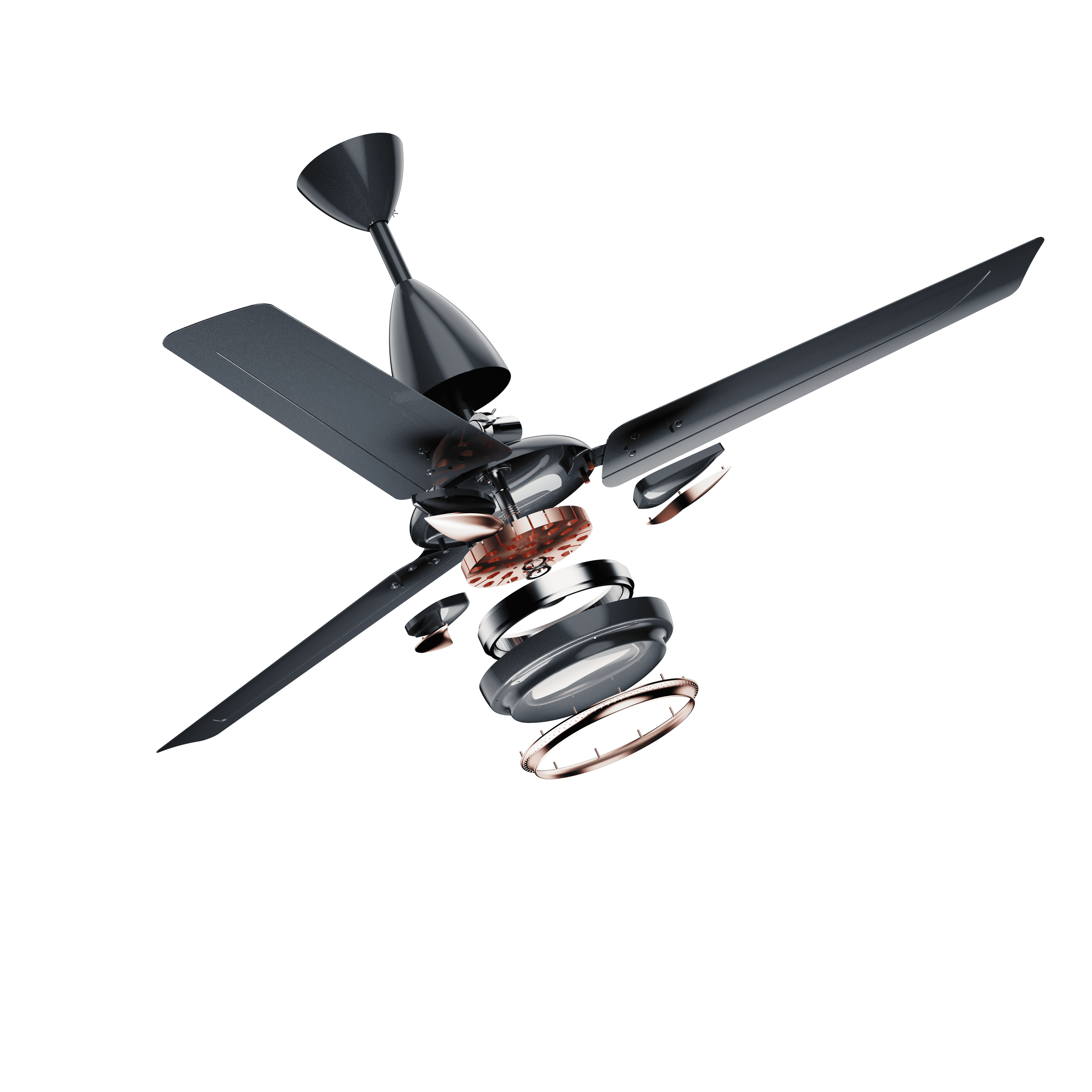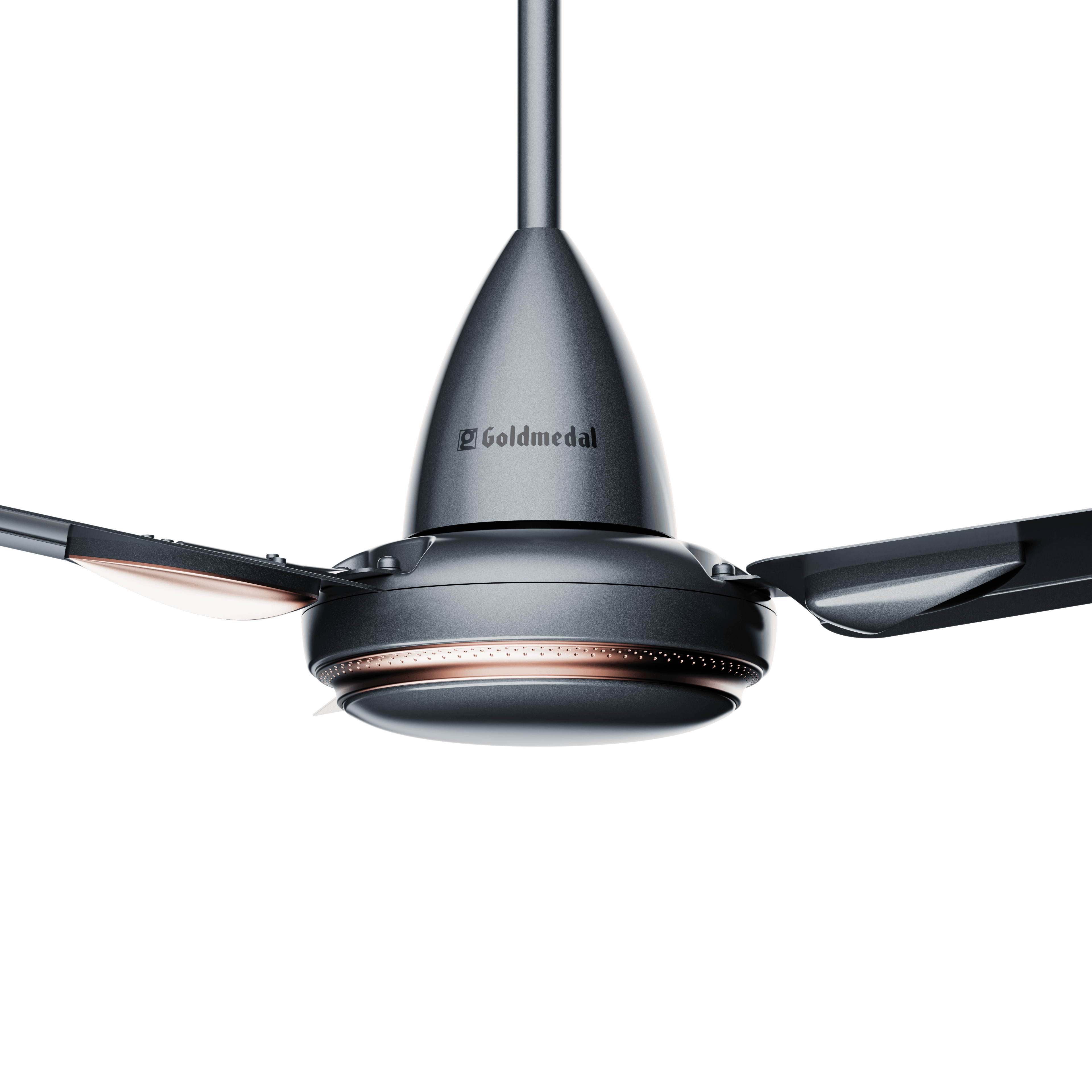 Design a mid-range ceiling fan tailored for the Indian market, featuring distinctive deco trims that elevate its visual appeal. The fan should balance contemporary styling with subtle decorative accents, creating a product that feels premium yet accessible. Focus on clean geometry, reliable performance, and trims that provide a unique identity without overwhelming the overall form. The result should resonate with diverse Indian interiors while offering a differentiated aesthetic within the mid-range category.