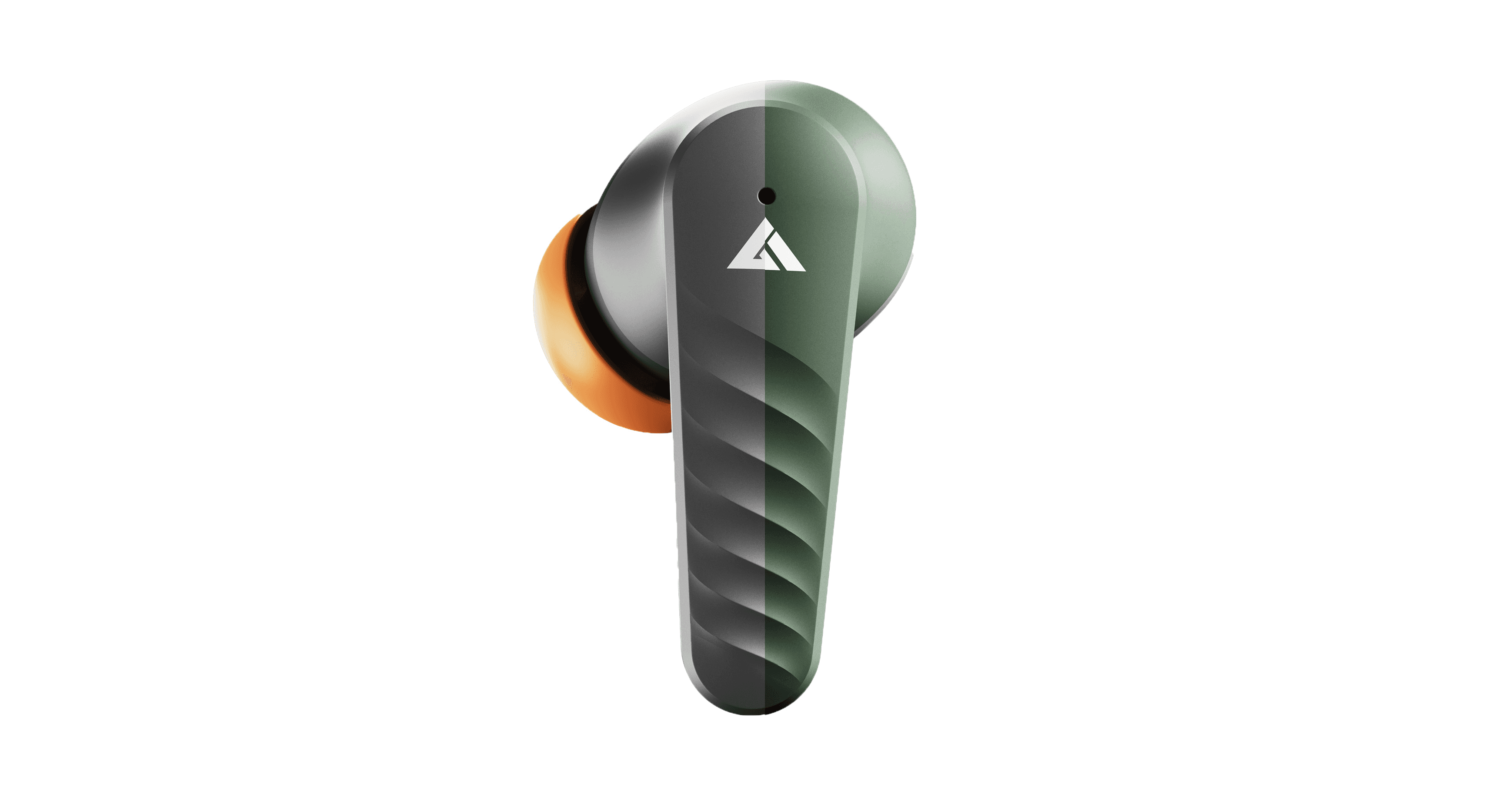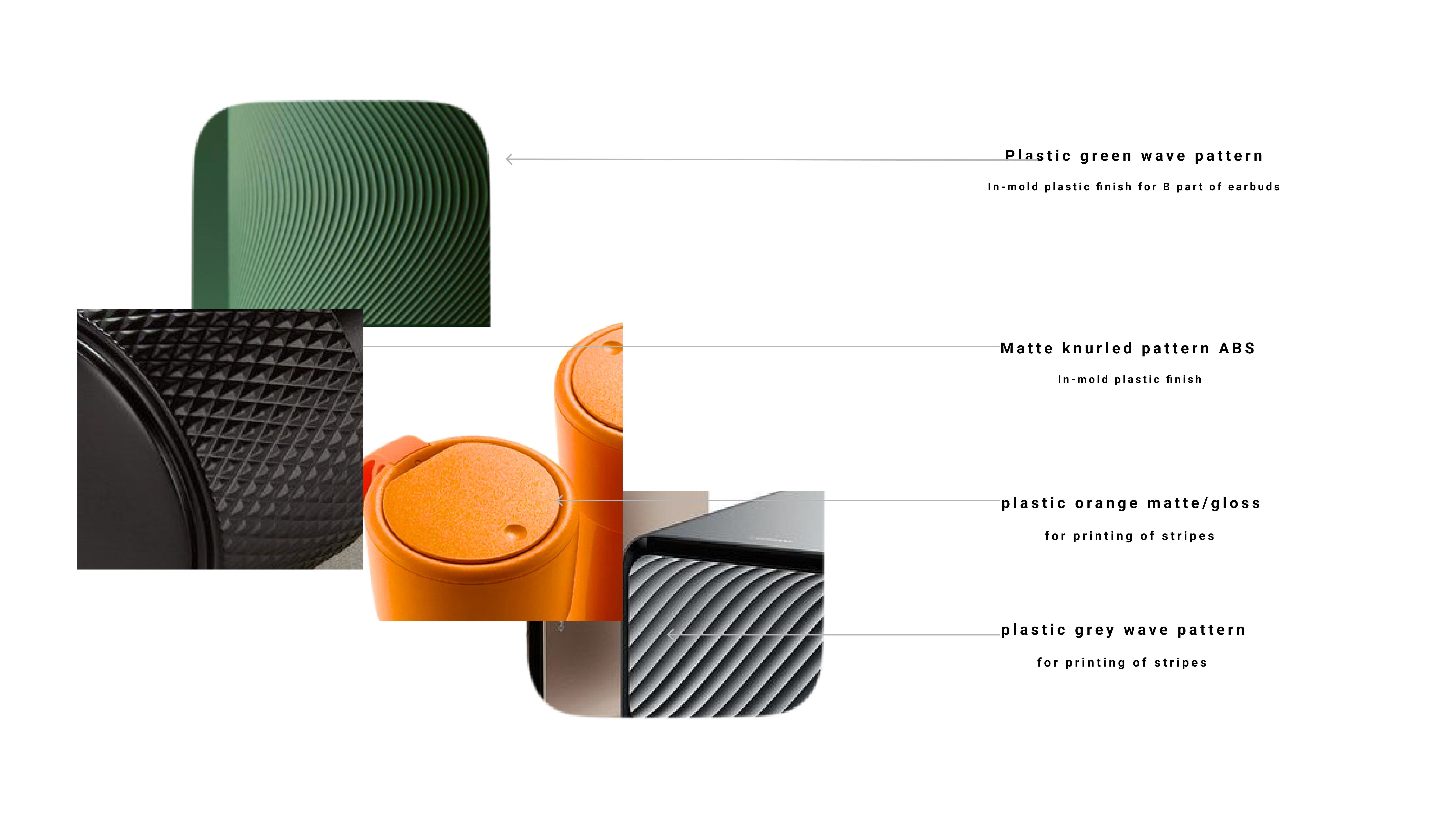 This CMF board represents a deliberate fusion of the two CMF directions—Calm Elegance and Energy Urban—translated into a single, cohesive surface strategy. The intent is to create an earbuds design that feels balanced yet expressive, where calm, nature-inspired surfaces coexist with bold, urban accents to appeal to younger, design-aware users.Soft wave patterns in green and grey are integrated directly into the plastic through in-mold finishes, forming the primary surfaces of the earbuds. These flowing geometries reference organic movement and sound waves, adding depth and tactility while maintaining a refined, calm visual character. The use of matte finishes on these areas reduces glare and fingerprints, reinforcing everyday usability and a premium hand-feel. In contrast, knurled matte ABS textures and orange accent elements introduce energy and grip. These zones are strategically placed on interaction areas, offering tactile feedback while visually signaling performance and motion. Matte-to-gloss variations on the orange components create subtle highlights, allowing stripes and details to stand out without overpoTogether, this layered CMF approach positions the earbuds as a single design platform with multiple expressions built into the surface language itself.