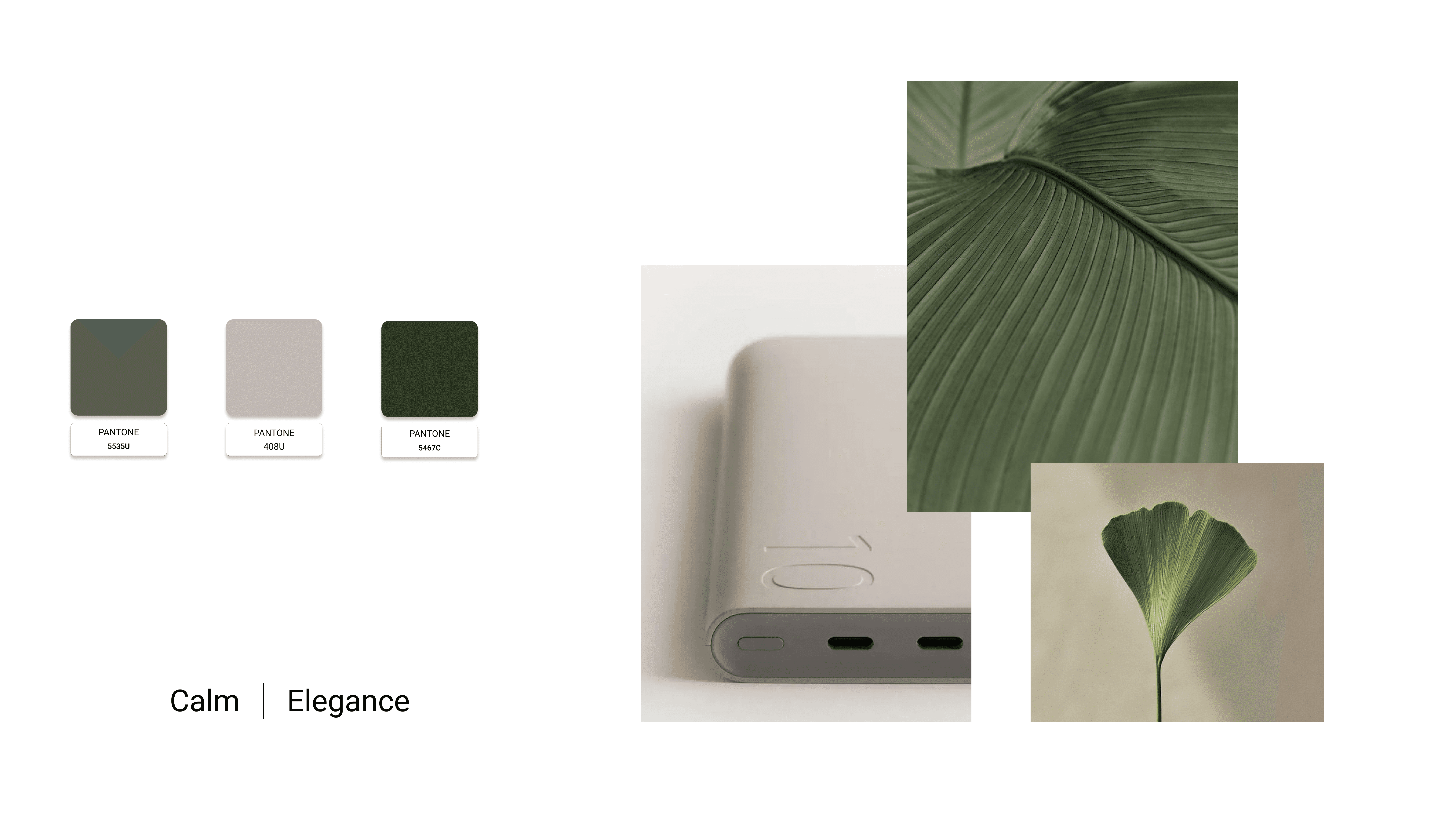The CMF direction is guided by a sense of calm, balance, and understated elegance, inspired by organic forms and muted natural tones seen in the moodboard. Soft greens paired with warm neutrals create a palette that feels grounded, modern, and emotionally soothing—positioning the earbuds as a lifestyle object rather than a purely technical device.